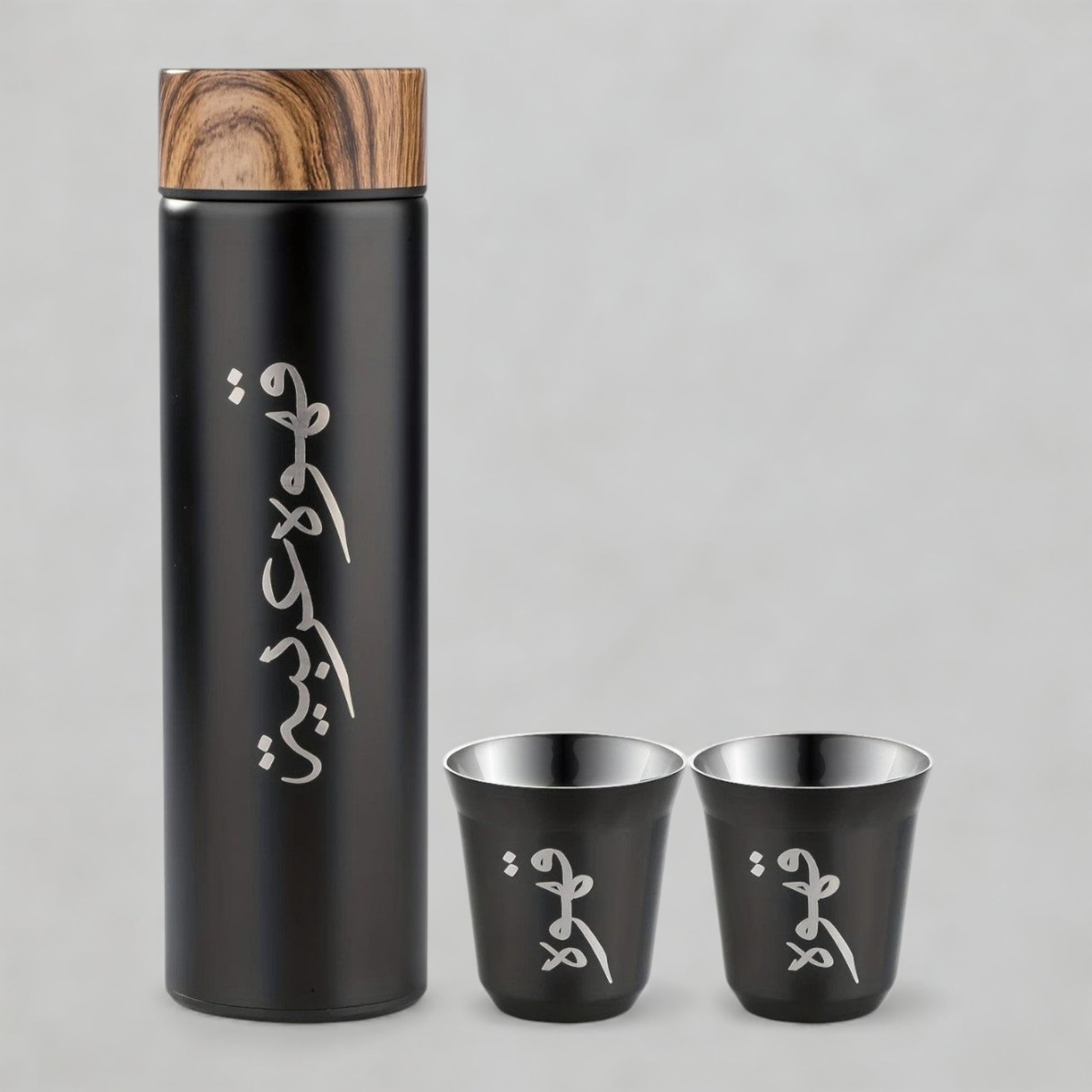 Enjoy authentic Arabic coffee in style with this Arabic Coffee Flask & Cups Set, featuring a sleek, modern design with elegant calligraphy details. The thermal flask keeps coffee warm for hours, while the stainless steel cups provide a traditional yet refined touch. Perfect for home, gatherings, or gifting, this set brings elegance to every coffee moment.
