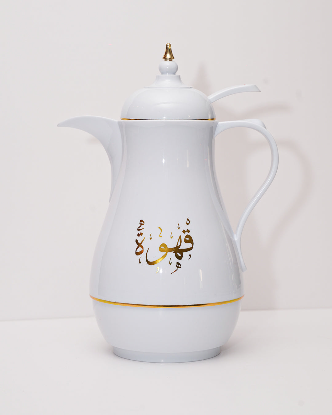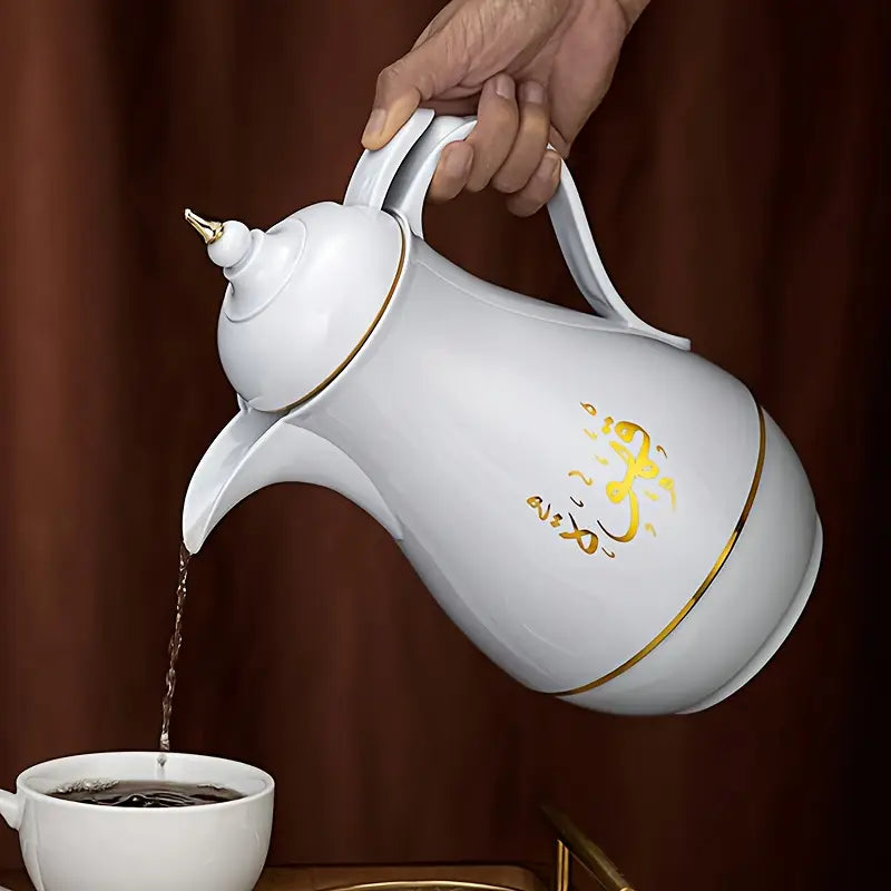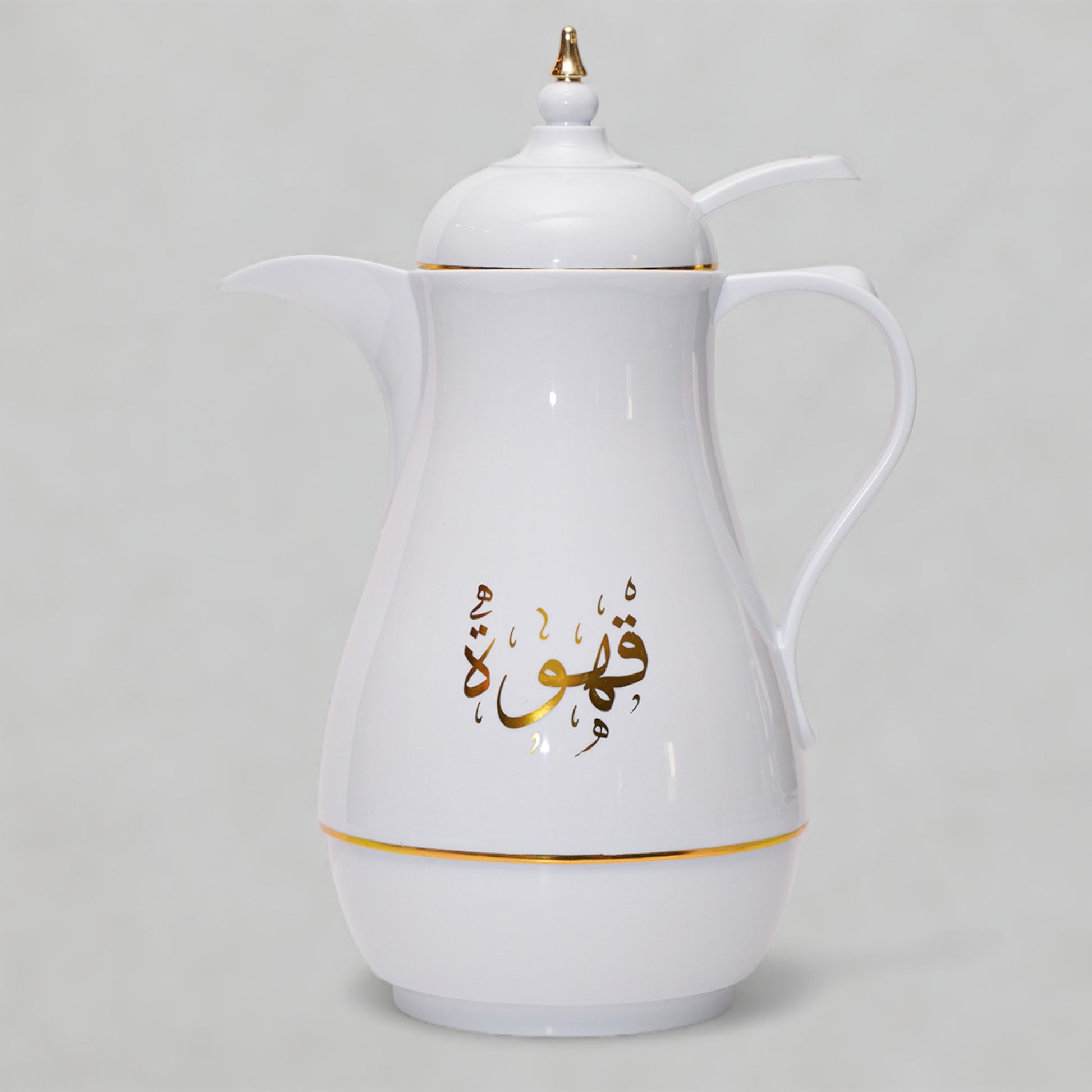 Celebrate the rich traditions of Arabic coffee with Dallat Al Qahwa—a beautifully crafted insulated dallah designed to preserve both warmth and elegance. Featuring a classic white finish adorned with gold accents and Arabic calligraphy, this kettle embodies timeless hospitality.
