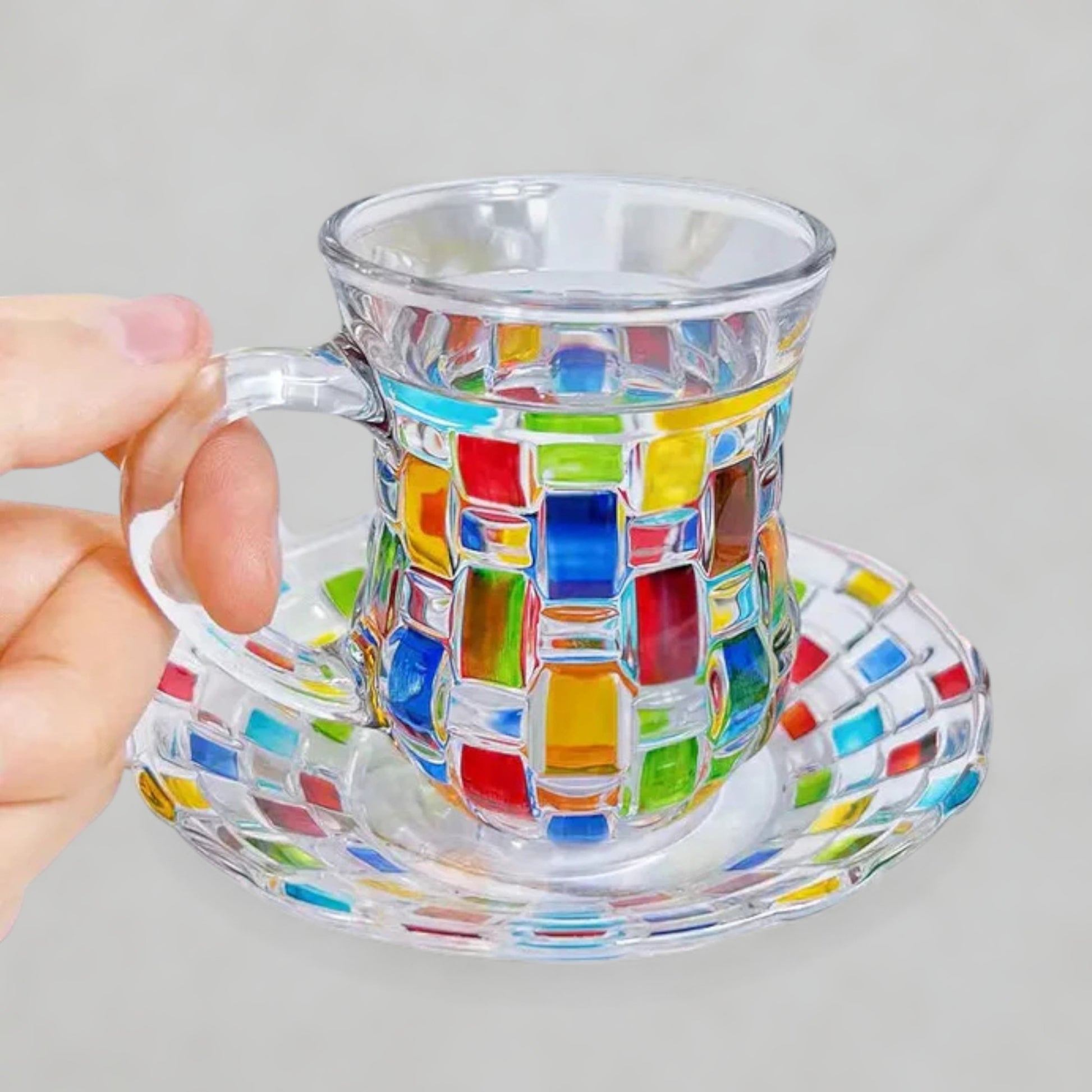 Bold and radiant like the moonlight that inspired its name, Finjan Shams brings a touch of drama and elegance to your tea moments. This mosaic glass teacup and saucer set is adorned with vibrant red and multicolored detailing, crafted to reflect the beauty of Middle Eastern design traditions.