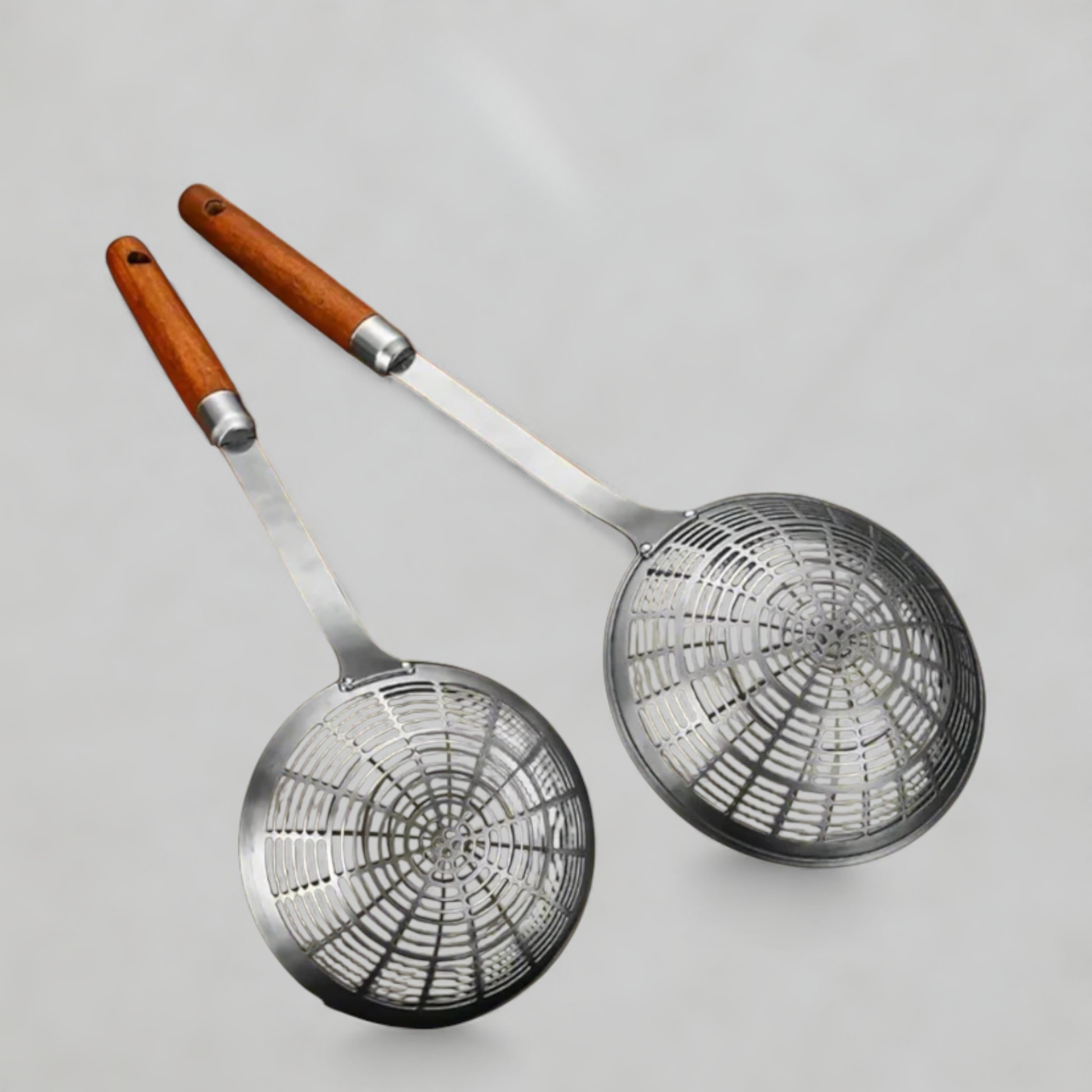 Designed for performance and style, this stainless steel skimmer with a carved floral head is perfect for straining, frying, or lifting food with ease. The wide perforated bowl ensures quick draining, while the long handle keeps hands safely away from hot oil or boiling water. The polished wooden grip adds a rustic, comfortable touch and makes it easy to hang for storage. Whether you're cooking dumplings, deep-frying, or blanching vegetables, this skimmer is a durable and elegant kitchen essential.