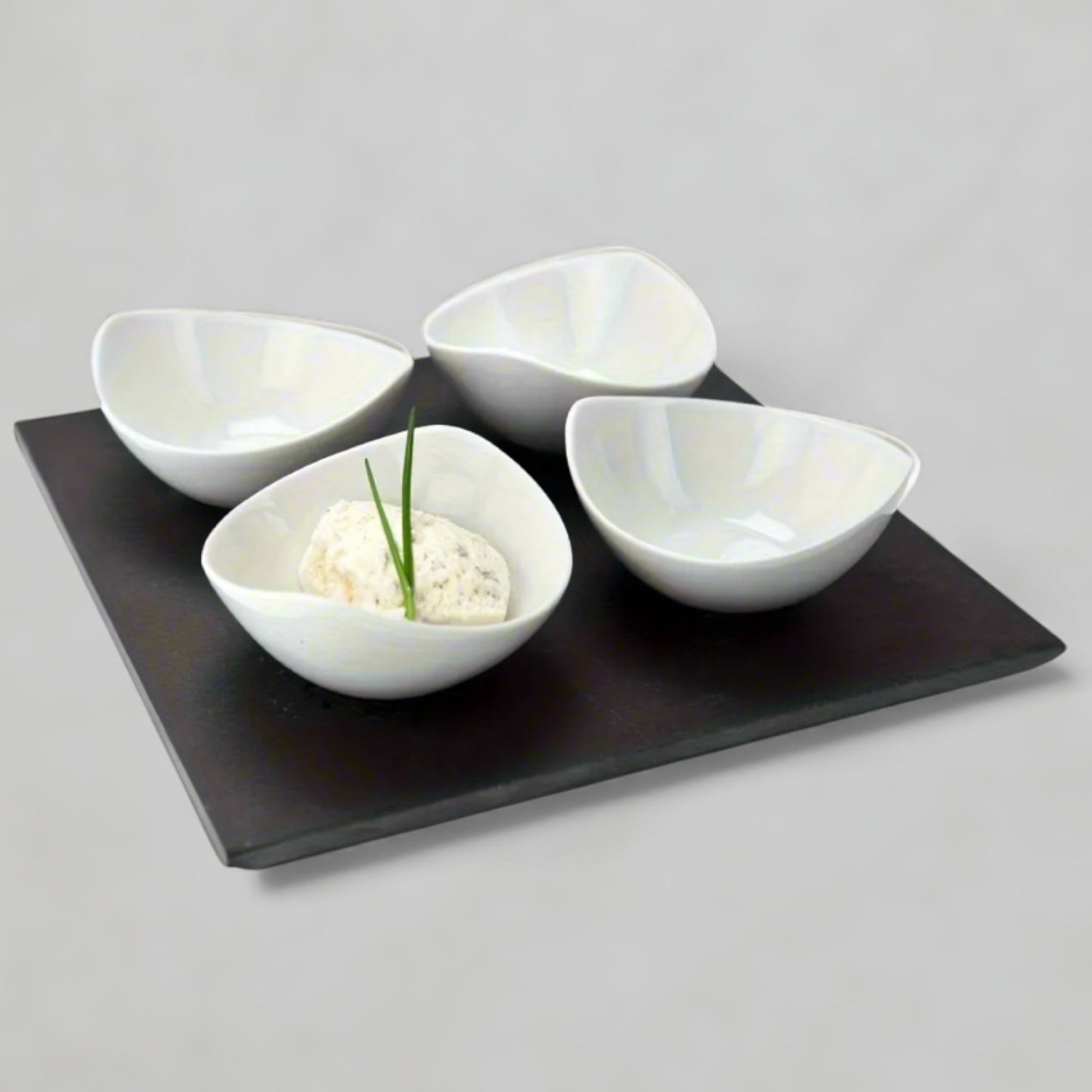 Set Includes: 4 ceramic bowls, 1 slate tray